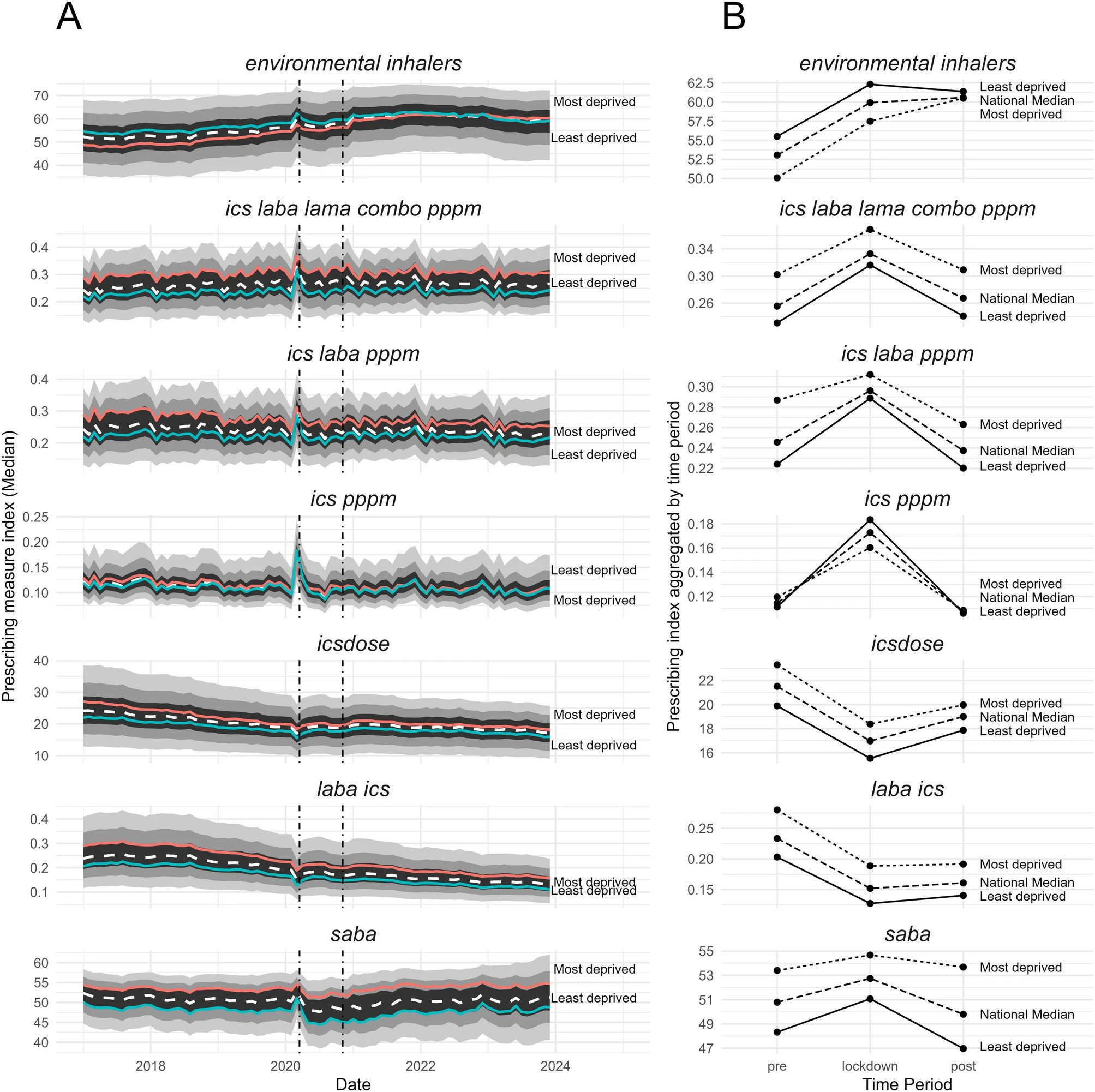 Prescribing of inhalers for asthma and chronic obstructive pulmonary disease is complicated due to multiple treatment pathways, diverse products, and variability in patients’ needs and usage habits. Factors such as social deprivation, air quality, and differences in access to primary care influence both demand on respiratory medications and the rate and manner in which they are prescribed. Inhaler prescribing metrics are valuable for analysing temporal and geographic prescribing patterns across socio-economic groups, whether to identify areas with higher disease incidence or to assess problematic prescribing practices. Using data from OpenPrescribing.net, we estimate prescription items dispensed for different inhaler drugs in England at Lower Layer Super Output Area or ‘neighbourhood’ level. Generating metrics at small-area level enables analysis of the interactions between individuals, their environment, and the localised health system within which they are being treated. This approach complements a patient-centred clinical model that considers individual patient needs. To explore changes pre- and post- the March 2020 COVID-19 lockdown, we profile prescribing temporally and by neighbourhood-level deprivation, measured by the Index of Multiple Deprivation. We develop and apply seven prescribing measures informed by national clinical guidelines which facilitate contextual comparison of prescribing behaviour between neighbourhoods. We find inequalities in prescribing behaviour, with the most deprived neighbourhoods associated with higher rates of emergency or ’rescue’ inhaler prescribing - a pattern that was interrupted during the March 2020 lockdown. Additionally, we find an increase in the prescribing of less environmentally friendly inhalers, contrary to national prescribing guidelines. This trend persisted until early 2022, when the trend began to reverse. Whilst many complex factors influence prescribing behaviour and safety, area-level deprivation appears to be an important dimension.